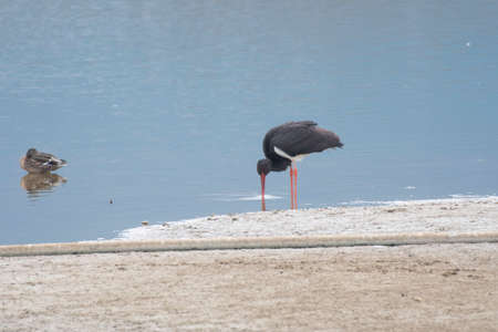 Black stork (Ciconia nigra) fishing on the lake