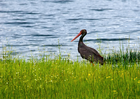 Black stork with a long red beak is standing in the meadow