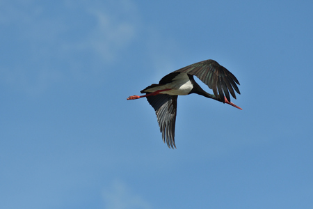 A Black Stork in flight on a sunny day in springtime, blue sky, Lower Austria