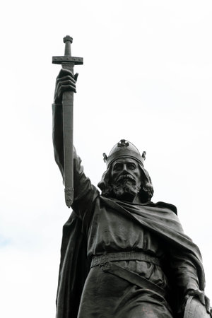 King Alfred The Great s statue designed by Hamo Thornycroft and erected in 1899 stands at the eastern end of the Broadway in Winchester, Hampshire, England with copy space