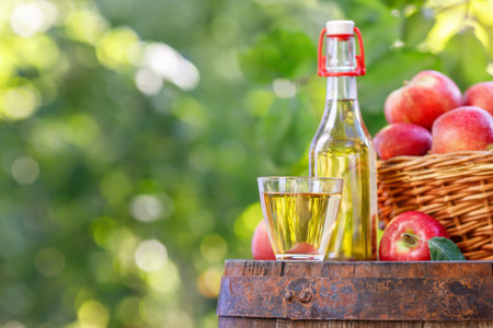 Glass with fresh cold French apple cider drink from Normandy region served with apples in green garden