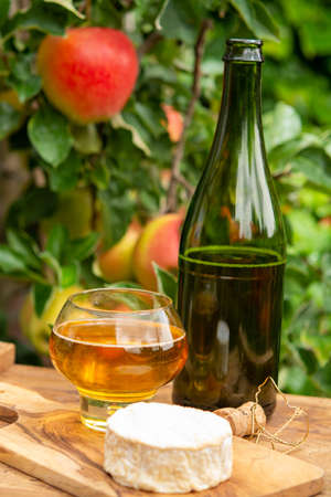 Taste of Normandy, France, glass of apple cider and camembert cheese served in orchard with green apple tree with ripe red fruits on background