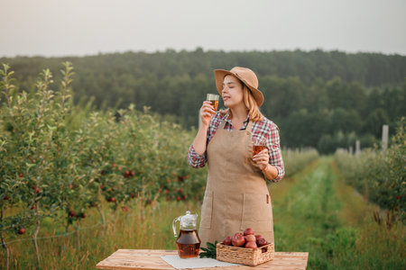 Happy smiling female farmer worker inhaling aroma of tasty apple juice in glass standing in orchard garden during autumn harvest. Harvesting time