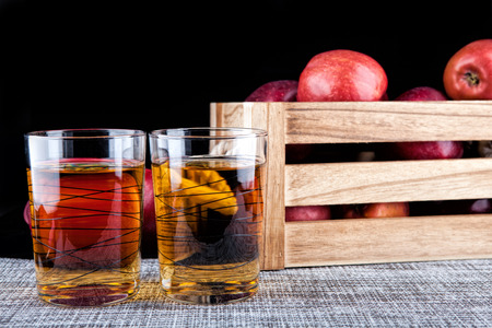 Summer still life in a rustic style, ripe garden apples in a basket and lie on the table, a glass of apple juice. Horizontal photo close-up.