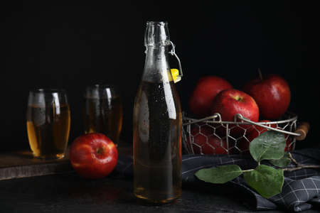 Delicious cider in glass bottles and apples on wooden table against dark gray background. Space for text