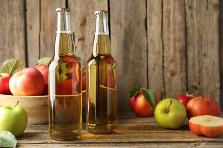 Delicious cider in glass bottles and apples on wooden table. Space for text