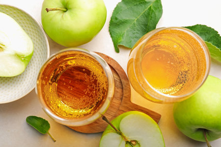 Apple cider, juice or fruit drink and ingredients on a sunny table. The concept of diet and weight loss. Apples help cleanse the body and reduce weight. Healthy eating,