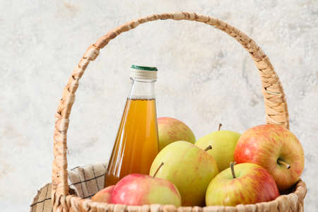 Basket with bottle of apple juice and fresh fruits on light background, closeup