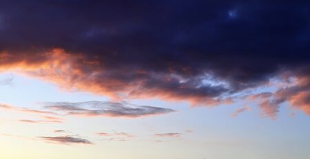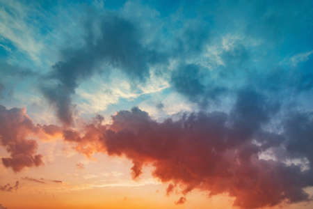 Sunset sky. Abstract nature background. Dramatic blue and orange, colorful clouds at twilight time.