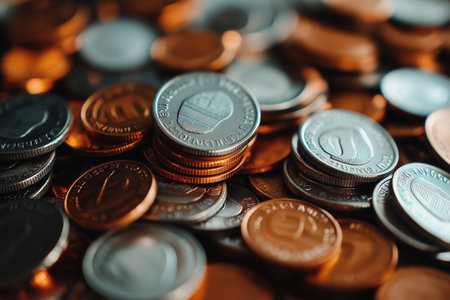A close up view of pile of various American coins, showcasing their intricate designs and metallic textures. image captures essence of currency and value