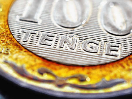 Translation of the inscription: tenge. Fragment of a Kazakh coin in 100 tenge. The name of the national currency in close-up in Latin. Economy, business and finance in Kazakhstan
