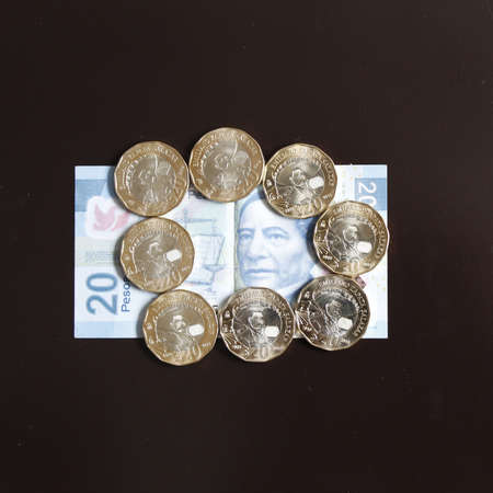 Flat Lay close up of new Twenty Piso Philippine Coins