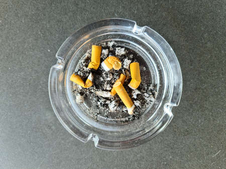 group of cigaret filters in a dirty clear glass ashtray after being burnt and smoked