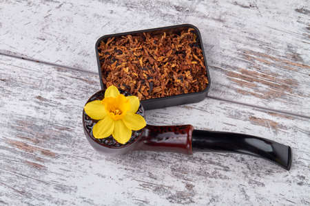 Smoking pipe with flower and tobacco. White wooden background.