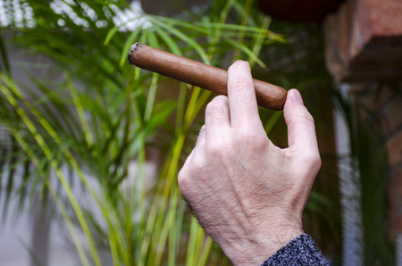 Detail of the hand of a smoking man holding a burning cigar in a garden with a blurred background