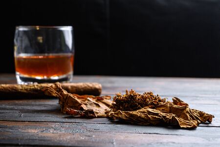 Dried tobacco leave and cut tobacco with cigar and whiskey rum on wood background on vintage dark table. side view space for text.