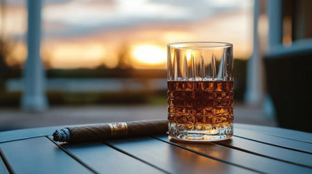 Relaxed Evening with a Glass of Whisky and an Aromatic Cigar on an Outdoor Wood Grain Tabletop