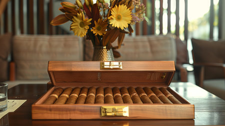 Luxurious Cigar Case with Gold Accents Showcasing Premium Cigars in an Elegant Setting. Concept of Opulent Lifestyle, Sophisticated Taste, Luxury Leisure.