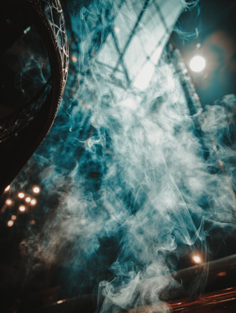 A captivating scene shows wisps of smoke rising in a modern indoor setting, illuminated by soft light and surrounded by a stylish atmosphere.