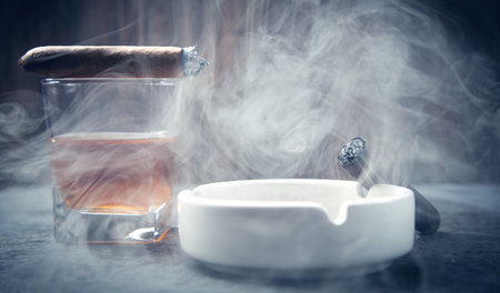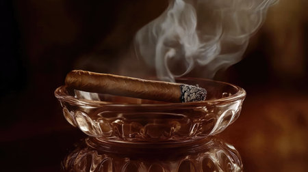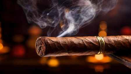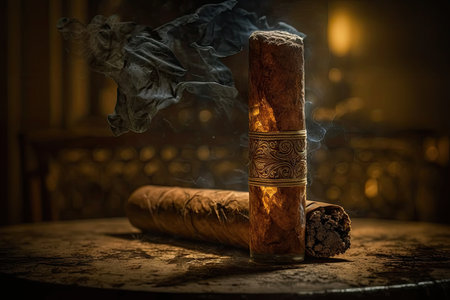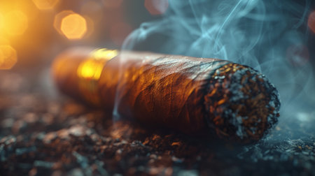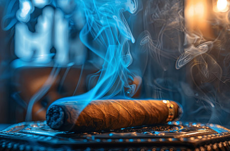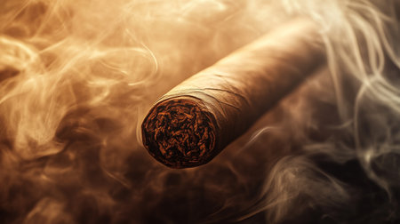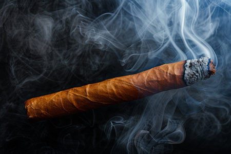 Close-up of a lit cigar with swirling smoke, dark and aromatic atmosphere. Smoking and luxury concept