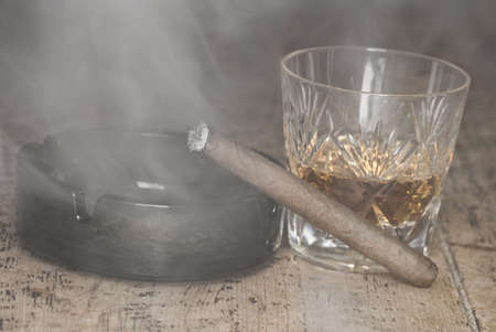 Close up of a cigar and cuban cigars on wood, featuring smoke and vintage color grading.