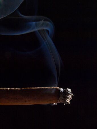 Smoking cuban cigar with blue smoke on an isolated black background. A Havana cigar burns and emits smoke in a dark bar. A rolled cigarette made from tobacco leaves. Burning cigar close up.