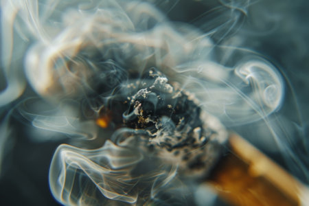 A cigarette is lit and the smoke is billowing out of it. The smoke is thick and dark, creating a mood of danger and discomfort. The image conveys the idea that smoking is harmful