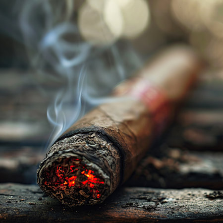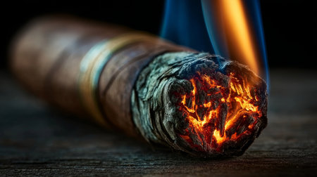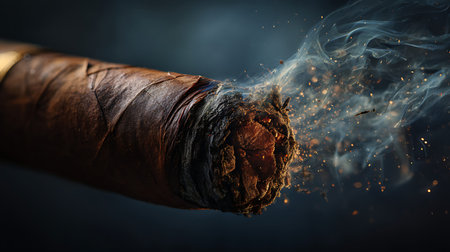 Close-up of a burning cigar with glowing embers and smoke in a dark atmosphere, capturing pleasure.