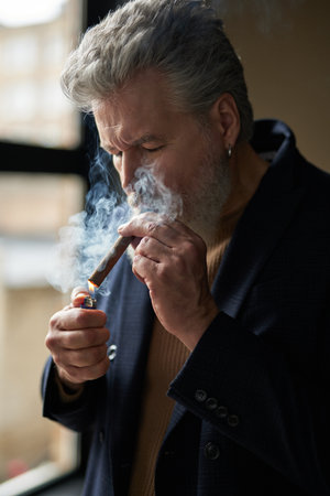 Portrait of elegant grey haired mature man lighting up cigar while standing indoors