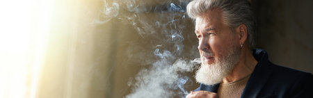 Close up portrait of brutal grey haired mature man looking away while smoking cigar
