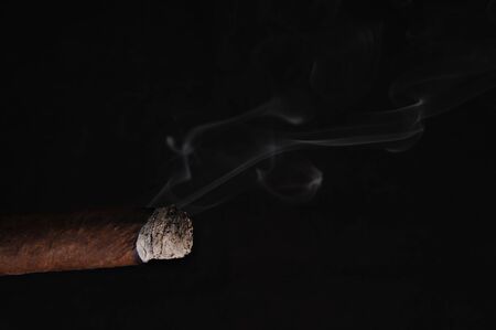 Close up of lit cigar with smoke on black background. Concept of smoking. Nicotine addiction
