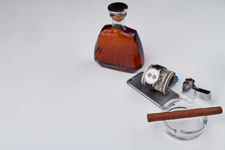 Glass of whisky on the rocks, cigar, ashtray and a cigar cutter