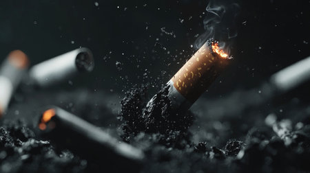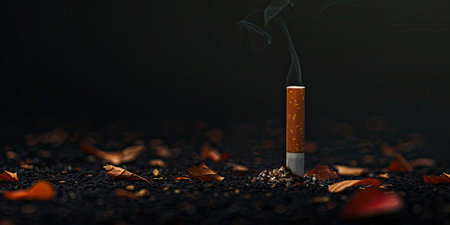Smoldering cigarette emitting smoke against a moody dark background, illustrating the harmful effects of smoking and the visual metaphor of addiction and health risks
