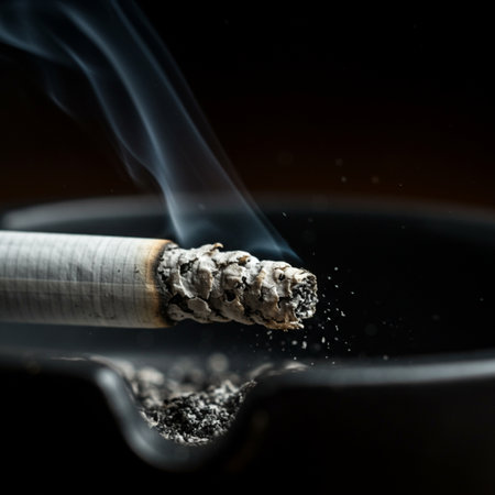 Close-up of a lit cigarette resting in an ashtray, soft smoke curling upwards against a dark background, the burning tip glowing red.