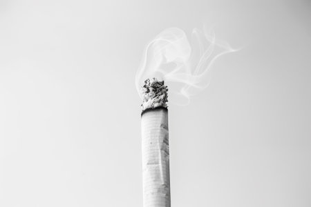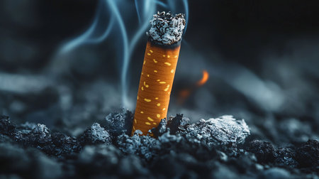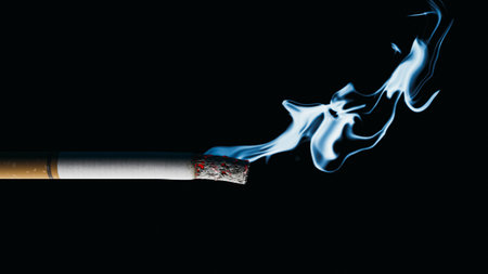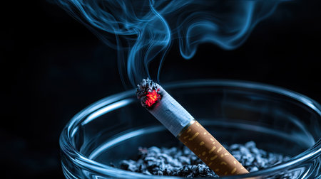 Smoldering cigarette emitting smoke against a moody dark background, illustrating the harmful effects of smoking and the visual metaphor of addiction and health risks