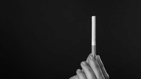Lighted smoking cigarette fingers close up on black background with copy space.