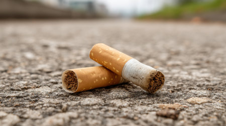 A detailed close-up image of two discarded cigarettes lying on a textured asphalt surface, emphasizing the impact of smoking on the environment and urban landscapes.