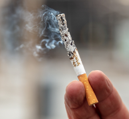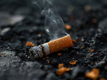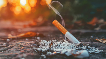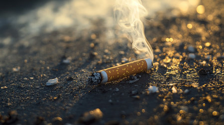 A cigarette butt smoldering on the pavement, surrounded by ash and debris, with a faint trail of smoke rising into the air.