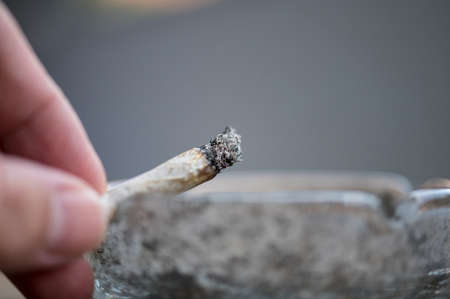 Extreme close up of a hand holding a rolling cigarette on an ashtray heavily soiled by ash