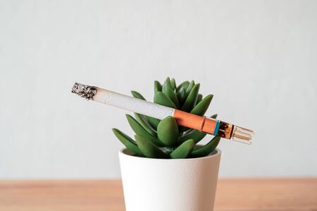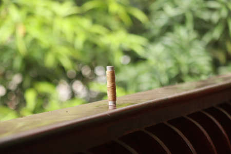 Cigarette burning in outdoors ashtray from smoker addictive nicotine unhealthy and danger concept