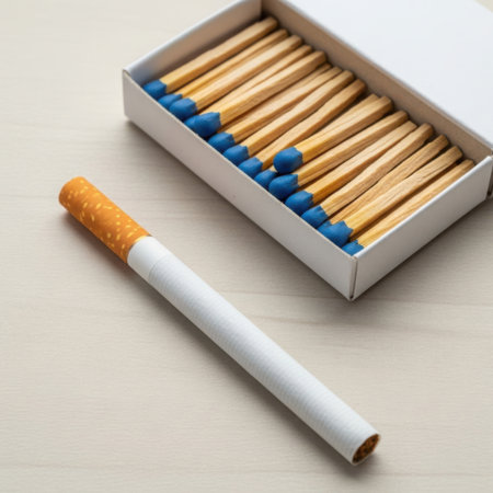 A single white cigarette with an orange tip lies next to an open box filled with numerous matches, their blue tips visible.