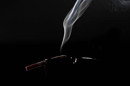 Lighted smoking cigarette fingers close up on black background with copy space.