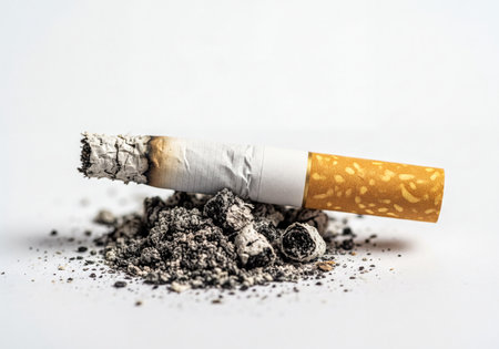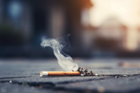 A cigarette butt smoldering on the pavement, surrounded by ash and debris, with a faint trail of smoke rising into the air.