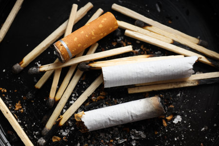 Close-up of cigarette butt extinguished in ashtray with smoke and ash. Concept of quit smoking. Nicotine addiction in smokers