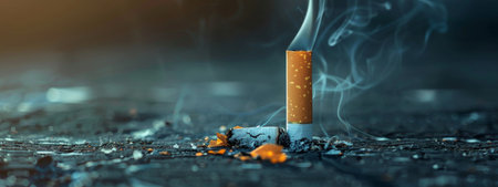 A close-up of a cigarette butt on the ground with wisps of smoke rising, emphasizing pollution, health issues, and littering.