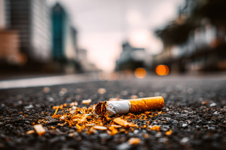 A cigarette butt thrown on the street, still emitting a thin stream of smoke, with a blurred cityscape in the background.