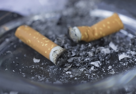 The concept of addiction to smoking, the remains of a cigarette in an ashtray.