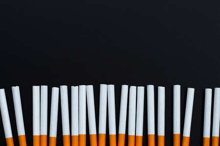 Cigarettes arranged in a row, black background