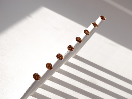 Arranged in a row cigarettes and scattered tabaco