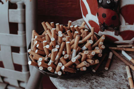 Saint Petersburg, Russia - 08/25/2020: smoked cigarettes in an ashtray. top view. rough surface texture